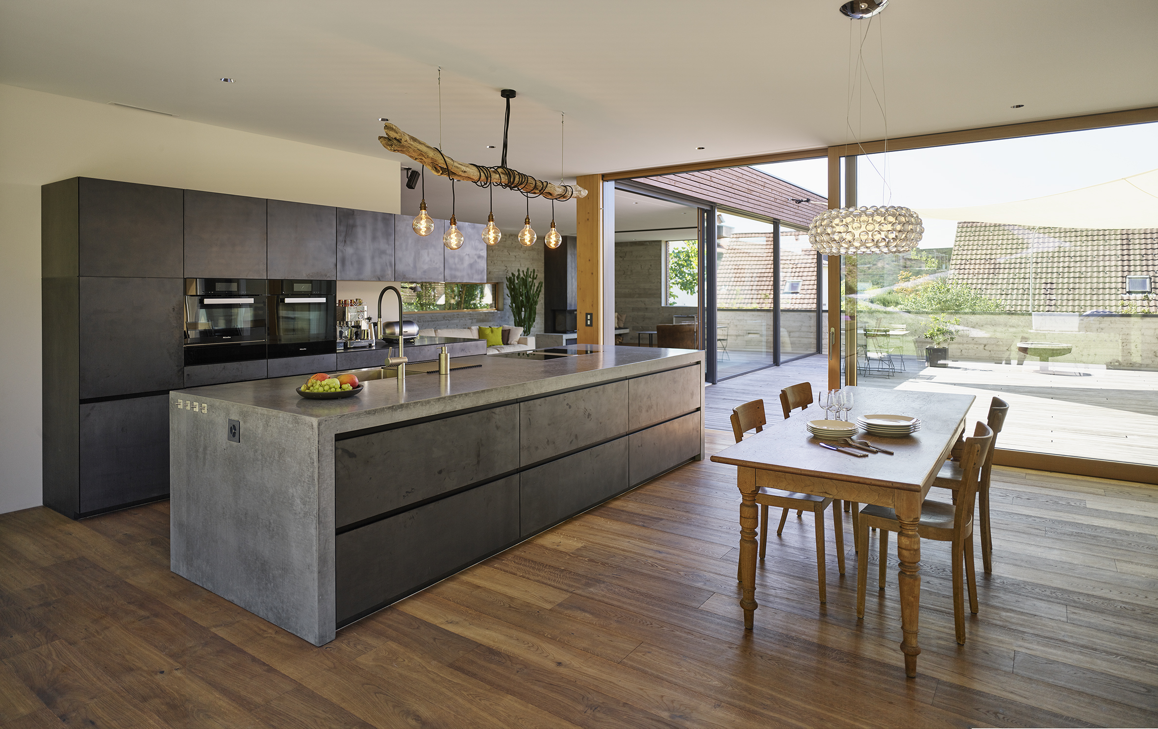 Holz-Metall-Fenster und Hebeschiebetüren - innen in schönem Naturholz, Aussen dunkel antrazith - Grosse Glasflächen erzeugen ein modernes und warmes Wohngefühl